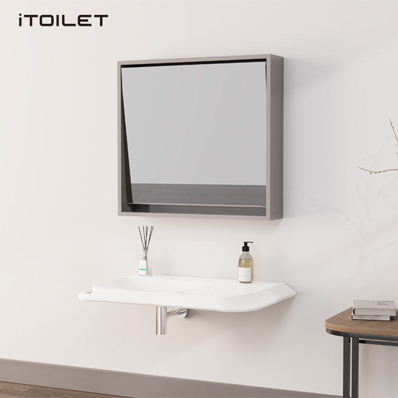 坐輪椅與站立時(shí)角度不同,鏡面傾斜,坐在輪椅上洗手時(shí),也能正常照鏡子,整理儀容。