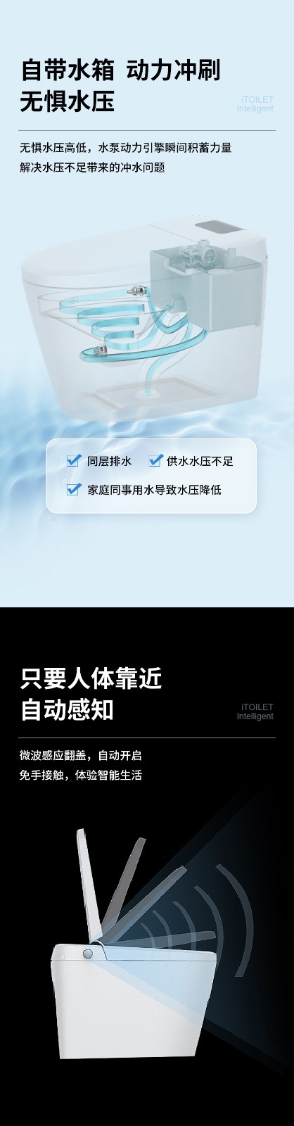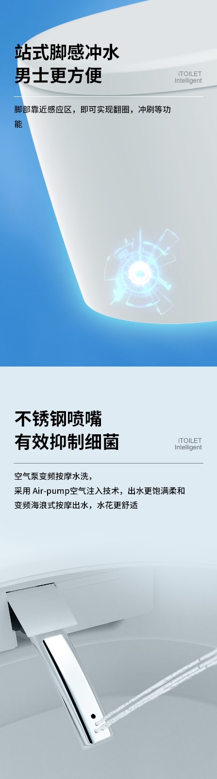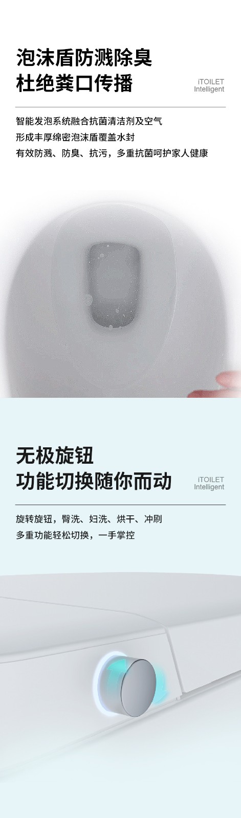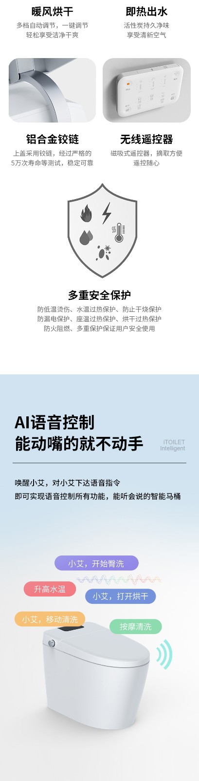 3、主要功能:AI語音控制(可選)、著座感應、腳感翻蓋/翻圈/沖刷(可選)、停電(接USB)沖刷、暖風烘干、無線遙控、凈味除臭、